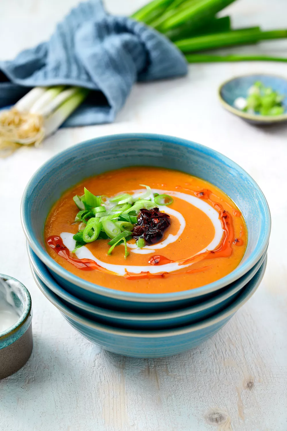 Pureer de soep glad met een staafmixer en garneer met kokosmelk, bosui en crispy chili olie.