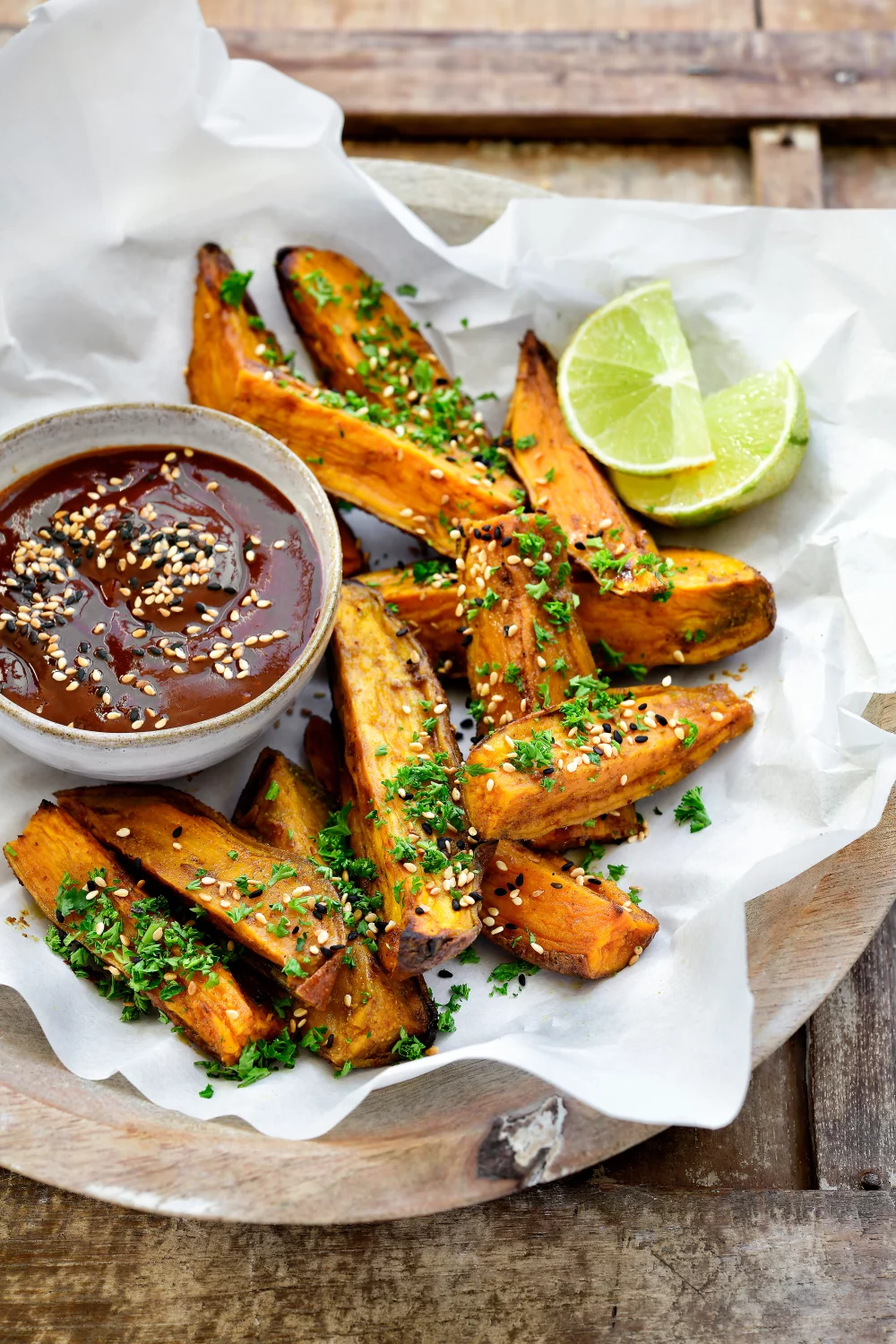 Haal de wedges uit de oven. Leg ze op een mooi bord en serveer ze met de ketchup. Werk af met de sesamzaadjes en de fijngehakte peterselie.
