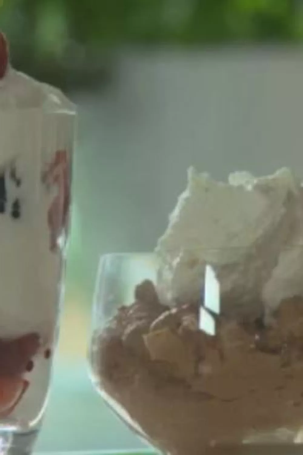 Neem de chocolademousse uit de ijskast en schep er een lepeltje room bovenop.