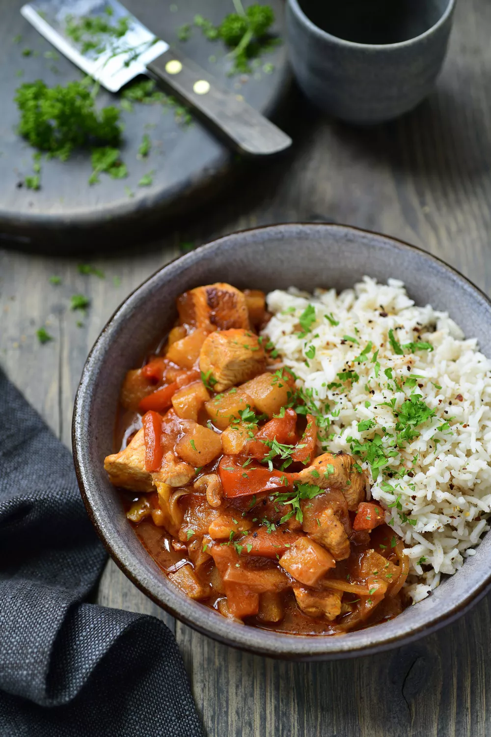 Deze zoete kalkoengoulash combineert malse stukjes kalkoen met zoete paprika, tomatenpuree en een verrassend fruitig toets voor een warme, toegankelijke smaak. Door de kalkoen kort krokant te bakken en vervolgens rustig te laten sudderen ontstaat een rijke, ronde saus die mooi intrekt. Perfect als snelle doordeweekse maaltijd of als hartige herfstschotel geserveerd met warme rijst.