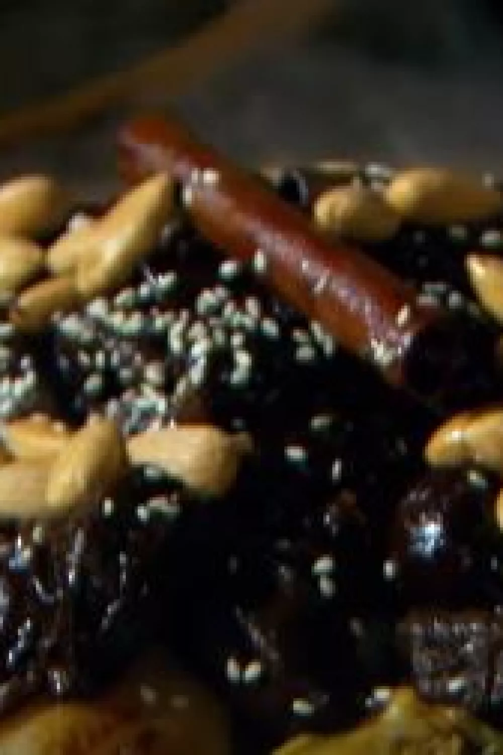 Werk de tajine af met de peren en de pruimen. Strooi de gefrituurde amandelen en/of sesamzaad over de tagine en laat nog twee minuten rusten.
