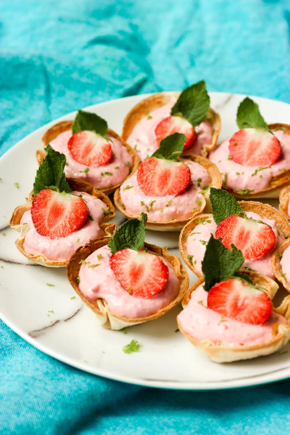 Zachte aardbeienmousse in knapperige tortillacups is een snel en feestelijk dessert voor lente en zomer. Met in de oven gebakken tortillavellen, romige mascarpone, pure aardbeien en frisse limoenrasp plus een vleugje kaneel combineert dit zoete hapje fruitige en romige smaken. Perfect als dessert bij koffie, als snack of voor een zomerse borrel met vrienden.