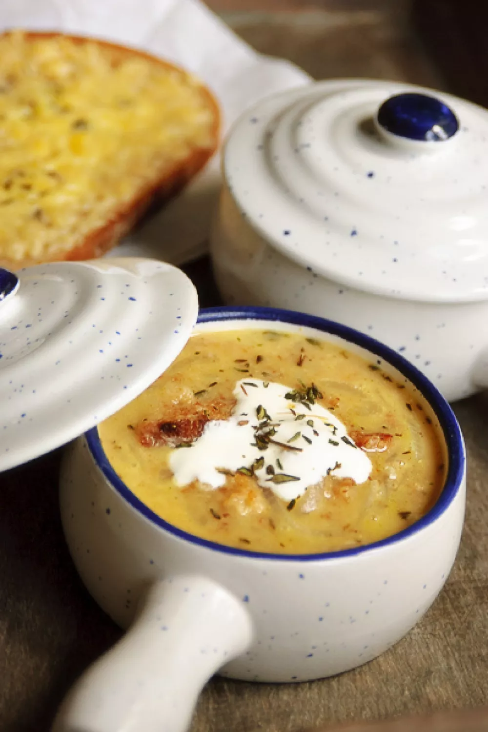 Garneer de soep met wat zure room en tijm en serveer er kaas tosti’s bij.