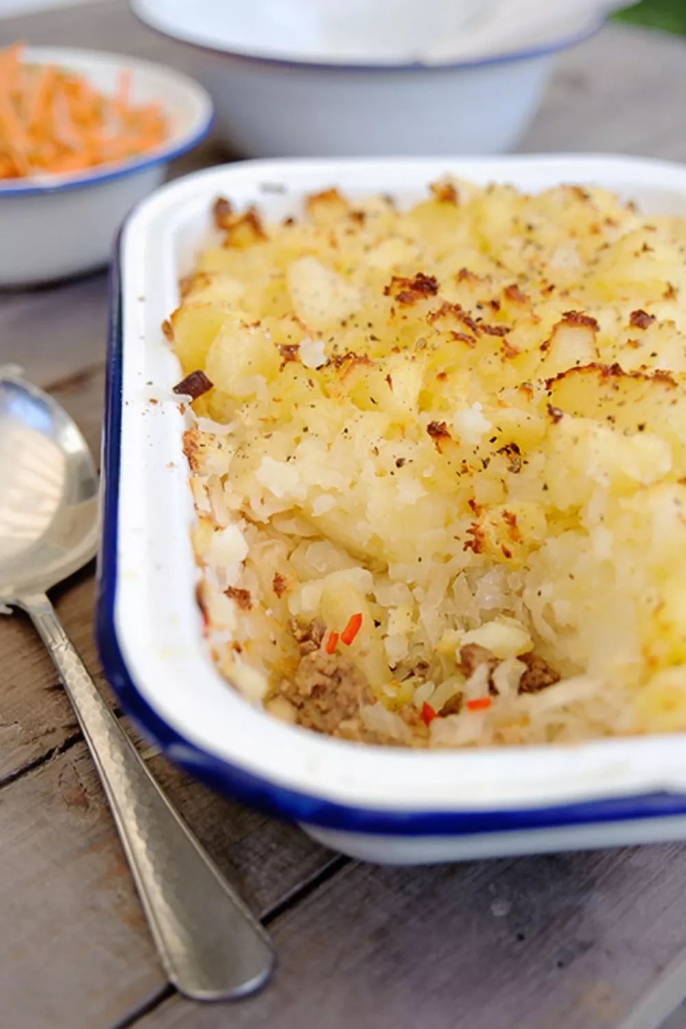 Giet de aardappelen en zuurkool af en laat de aardappel even droogstomen. Verdeel het ananasmengsel over het gehakt en leg hier de zuurkool op. Gebruik een stamper om de aardappel ietwat kapot te stampen en leg de aardappelen op de zuurkool.