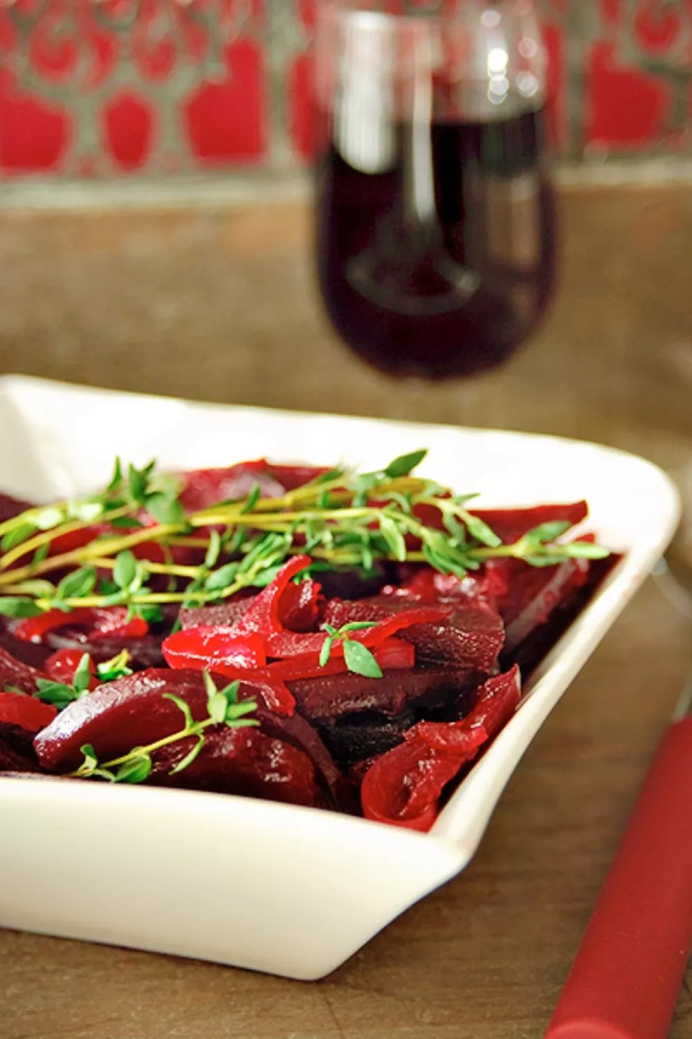 Zoetzure bietjes met sinaasappel, gember en tijm zijn een kleurrijk en warm bijgerecht waarin de aardse smaak van rode biet wordt opgefrist door kandijstroop en sojasaus. De uien worden zacht gebakken waarna de bietjes kort geroerbakt en zachtjes in de sinaasappelstroop gesudderd worden voor glans en diepte. Perfect bij kip of kalkoen en geroosterde aardappelen, ideaal voor herfstige diners en feesttafels.