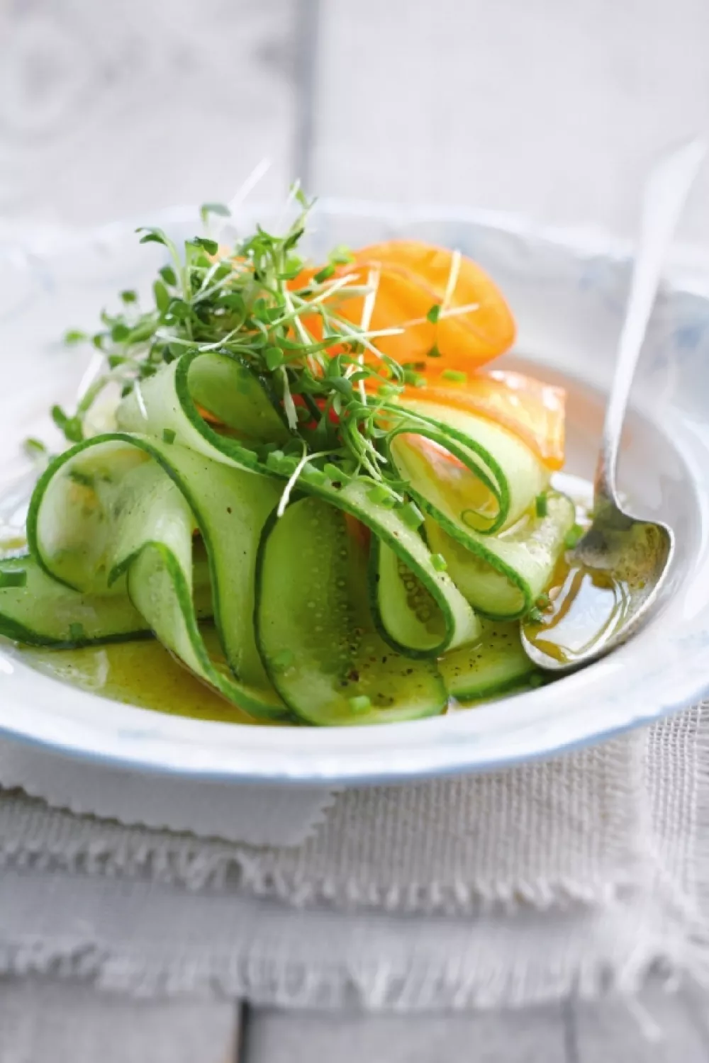 Deze zoetzure komkommersalade combineert frisse komkommer en knapperige wortel met een licht pittige kerriedressing op basis van witte wijnazijn. De groenten worden in fijne linten gesneden en met lauwe dressing gemarineerd, waarna bieslook en tuinkers voor extra frisheid en textuur zorgen. Perfect als zomers bijgerecht bij gegrild vlees of vis, een snelle lichte salade voor familiediners of een picknick.