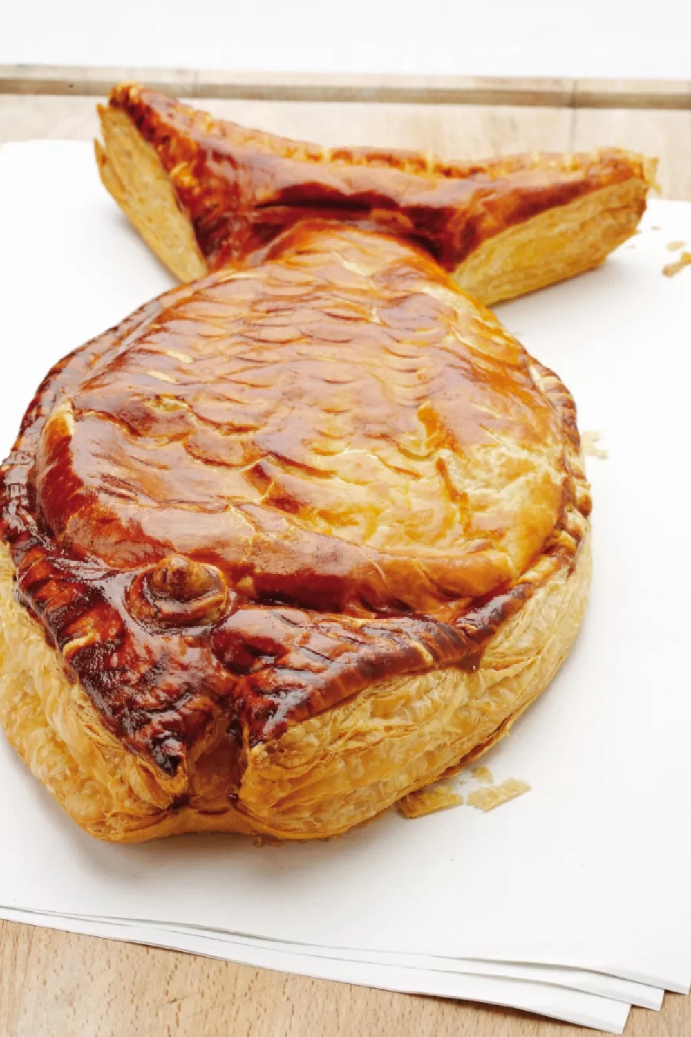 Snijd het vel bladerdeeg in twee en leg de vis op een helft. Breng op smaak met peper en zout en verdeel het paddenstoelenmengsel over de vis. Leg hierop de andere visfilet en strijk de randen van het bladerdeeg in met ei. Bestrijk ook de tweede helft bladerdeeg met eigeel, bedek hiermee de vis en druk zacht aan. Snijd het deeg in de vorm van de vis, bestrijk met ei en plaats 20 minuten in de oven.