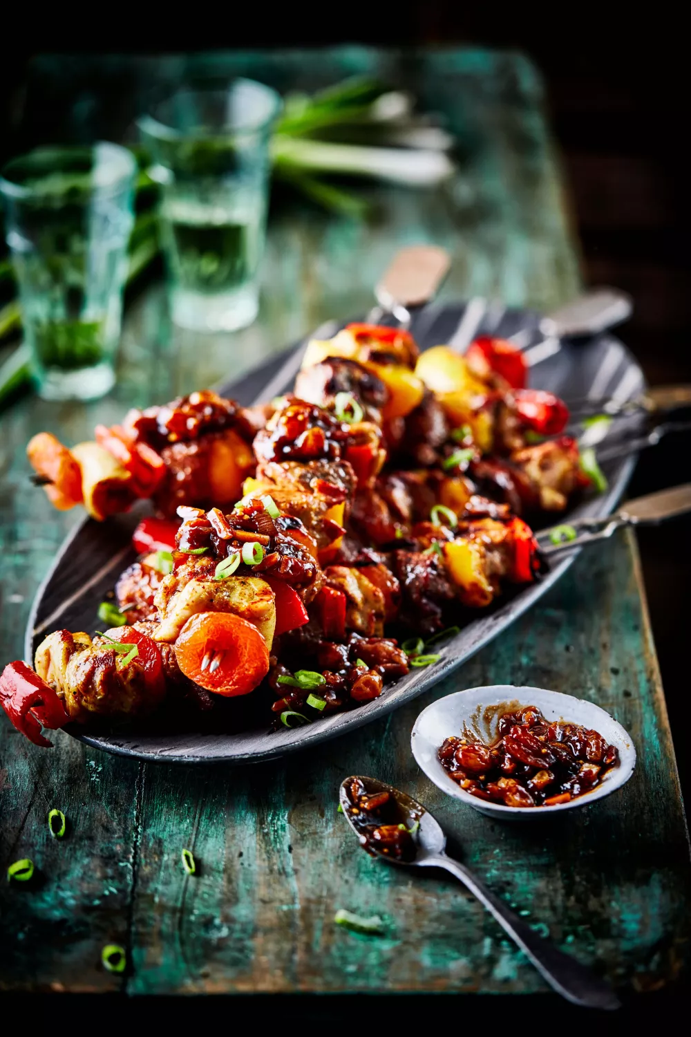 Zachte lamsblokjes en sappige kip worden op satéprikkers afgewisseld met zoete abrikozen en kleurrijke paprika in een Zuid Afrikaanse sosatie die zowel zoet als rokerig smaakt. Geroosterde fenegriek, komijn en mosterdzaad vormen een geurige kruidenmarinade die het vlees diepgang geeft. Kort grillen op de BBQ zorgt voor knapperige randen en rosé lamsvlees, perfect voor zomerse barbecues en feestelijke avonden.