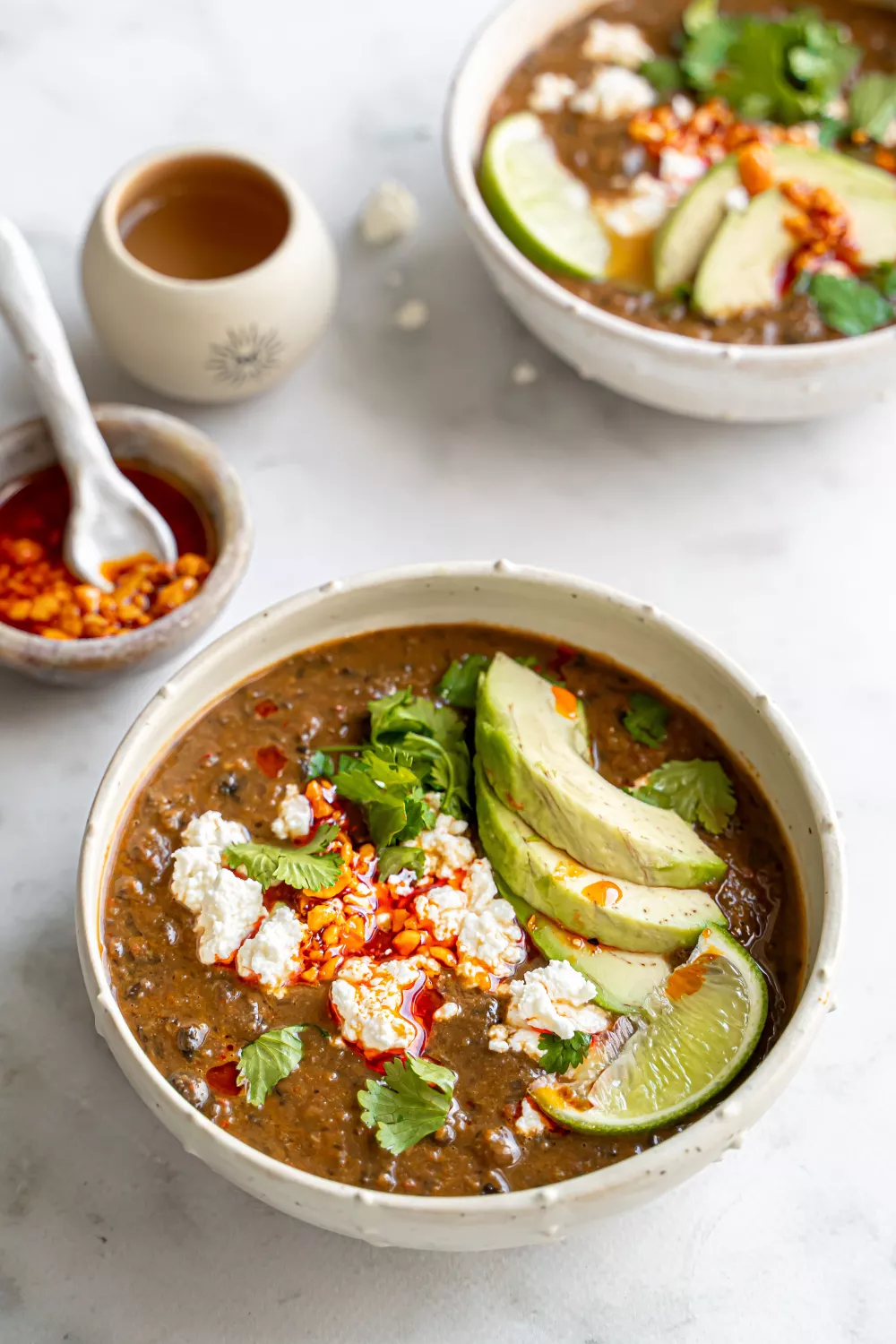 Romige zwarte bonensoep met avocado en salsa macha combineert rokerige chipotle, komijn en korianderzaad tot een hartige, Mexicaans geïnspireerde maaltijd. Groenten worden kort aangefruit, vervolgens geprutteld met bouillon en gepureerd voor een fluweelachtige basis met nog wat hele bonen. Met verkruimelde witte kaas, verse koriander en limoen is het ideaal als verwarmende doordeweekse maaltijd of stevige lunch in herfst en winter.