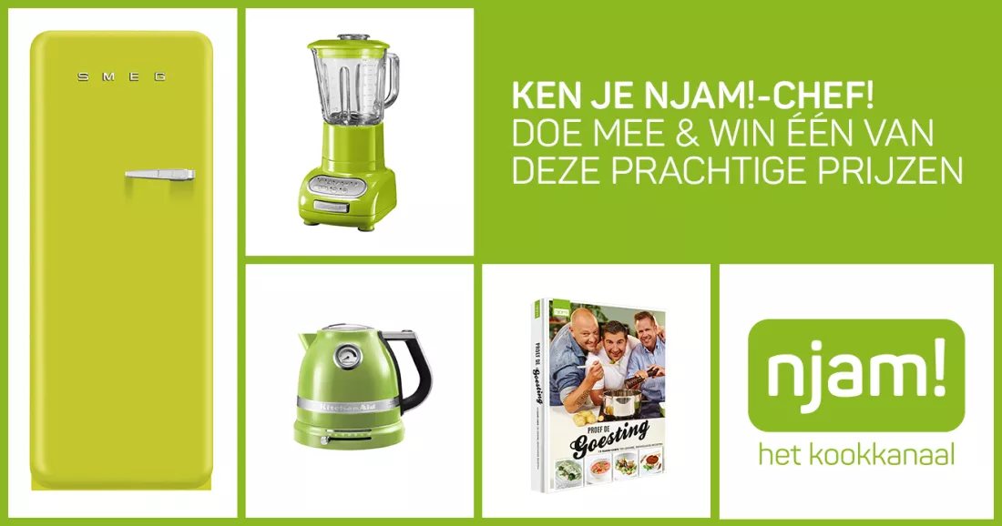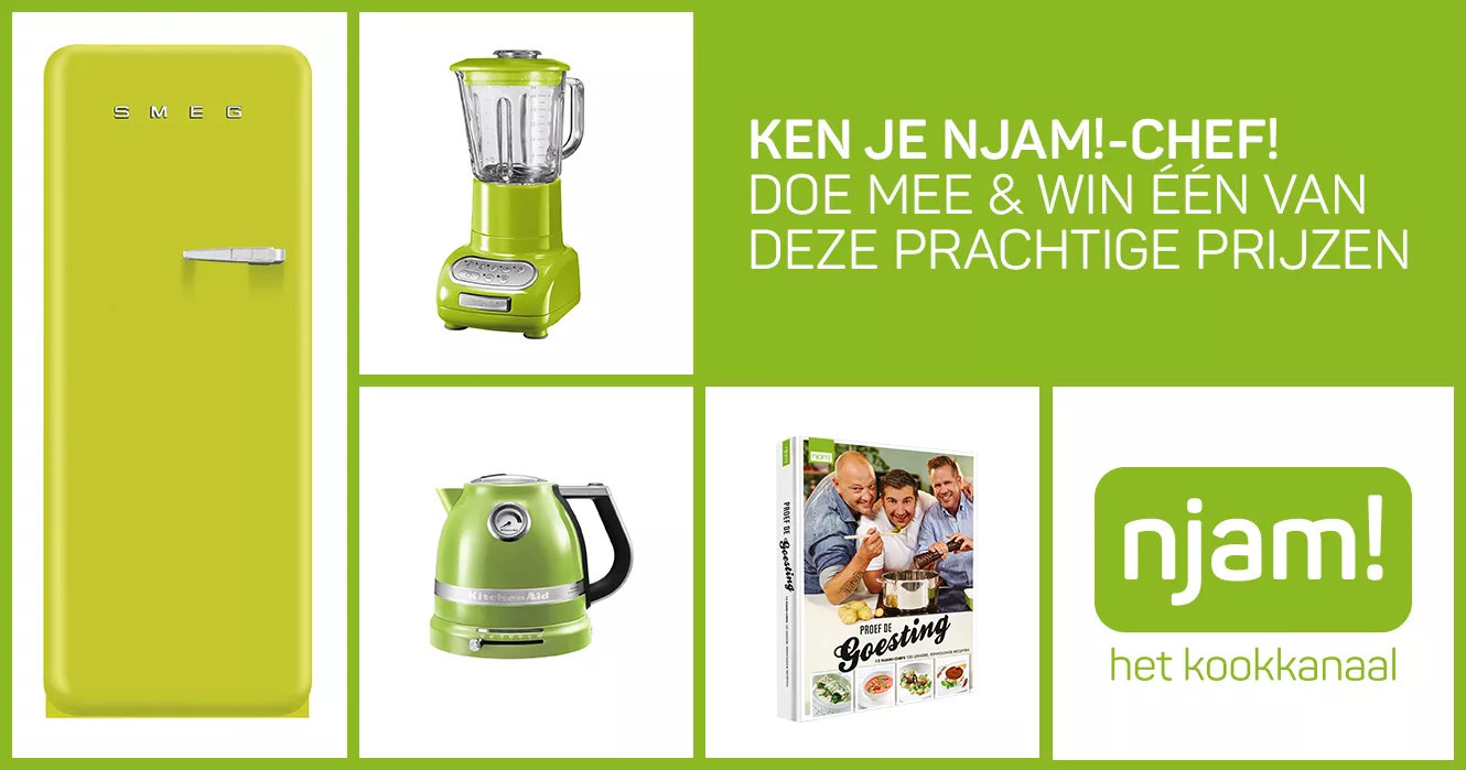 Ken jij alle njam!-chefs? Ter ere van onze gloednieuwe website organiseren we een feestelijke wedstrijd waarbij je onze site beter kan leren kennen én bovendien ook kans maakt op tal van prachtige prijzen zoals een koelkast van SMEG, een blender en waterkoker van KitchenAid én gesigneerde exemplaren van het njam!-boek "Proef De Goesting"!