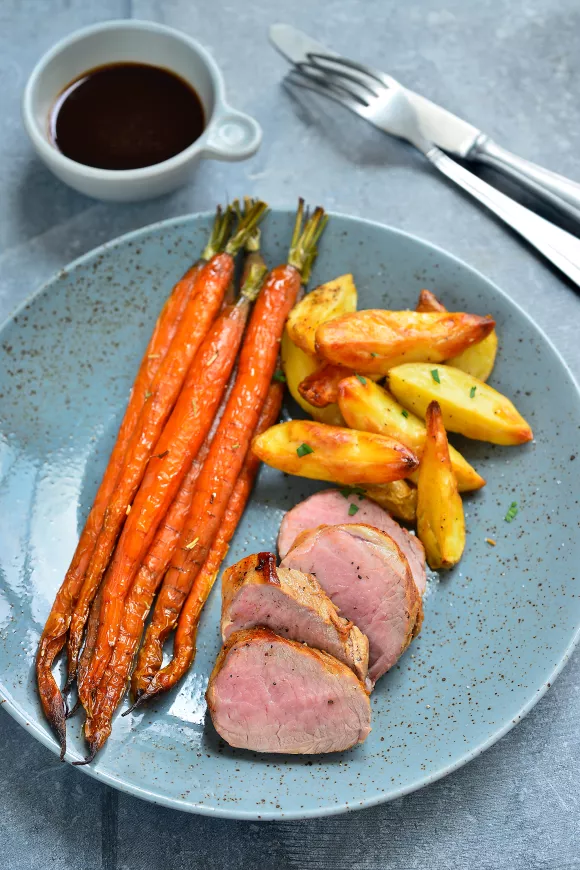 Varkenshaasje met gebakken krielaardappelen en worteltjes