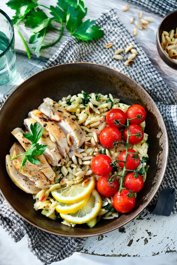 Risoni met spinazie, gerookte scamorza en gebakken kip